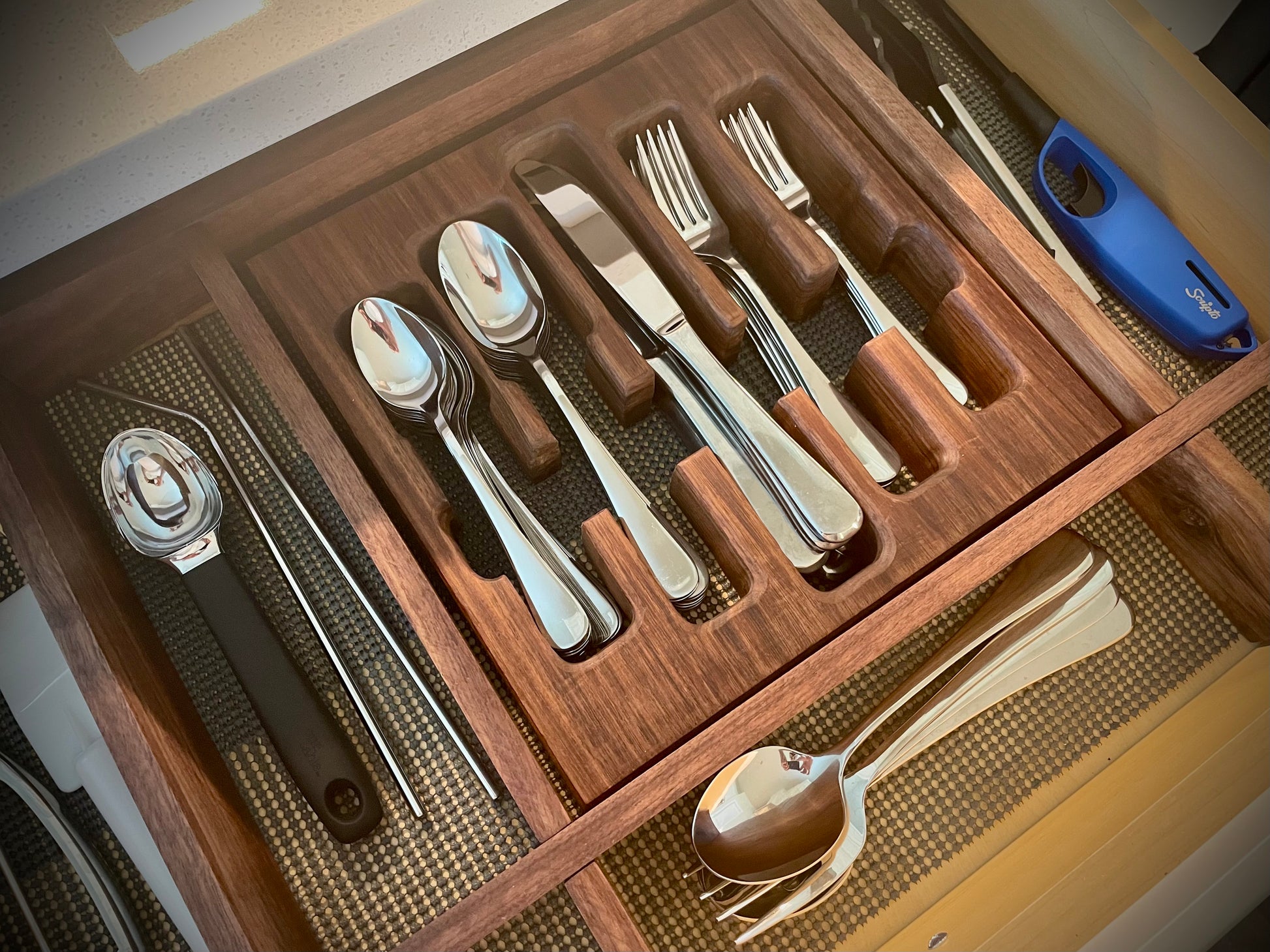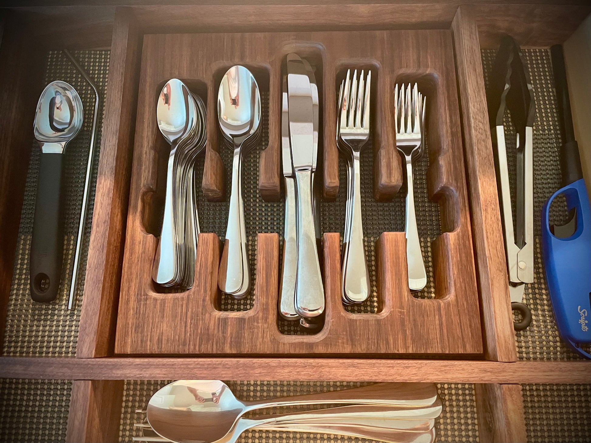 Simplify your kitchen with our luxurious cutlery organizer. Crafted from solid wood, our one piece drawer organizer elegantly holds spoons, knives, and forks, accommodating 6-8 pieces each. Enjoy effortless organization with a touch of sophistication.