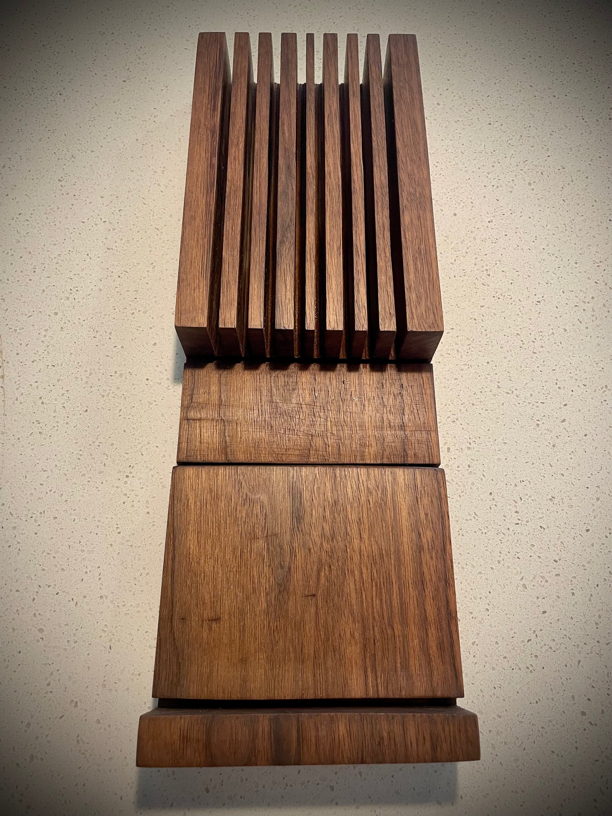 Organize 8 knives in one place with the Knife Organizer. Made from one piece solid wood with a hand rubbed zero VOC finish, it's not only durable but also environmentally friendly. Keep your knives easily accessible and your kitchen drawer clutter-free.